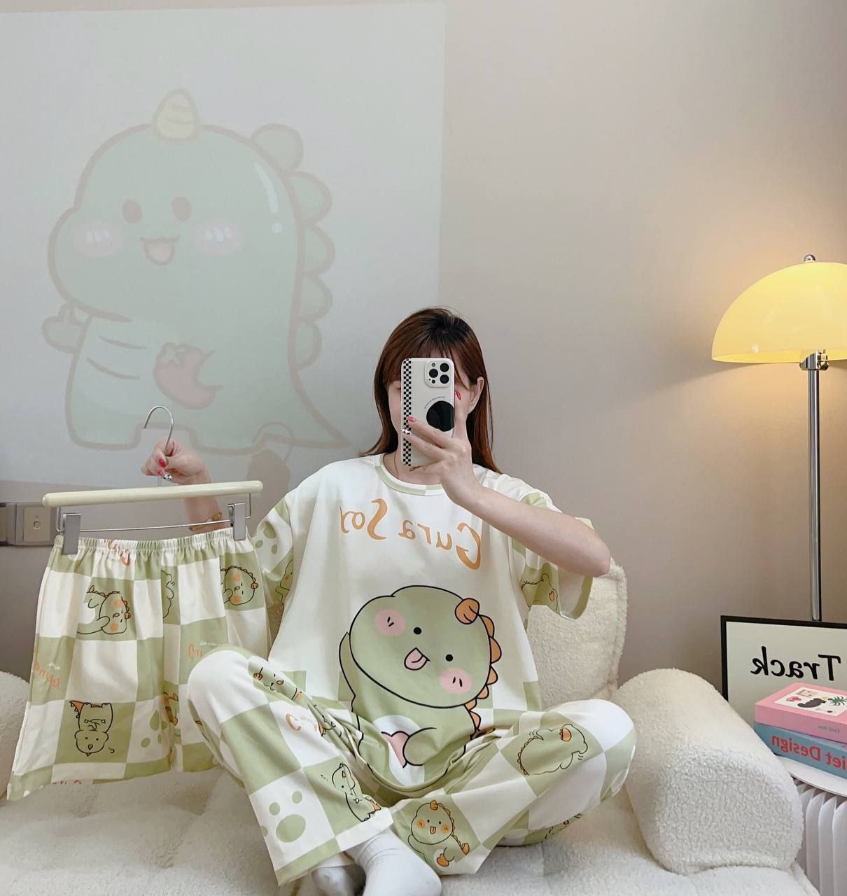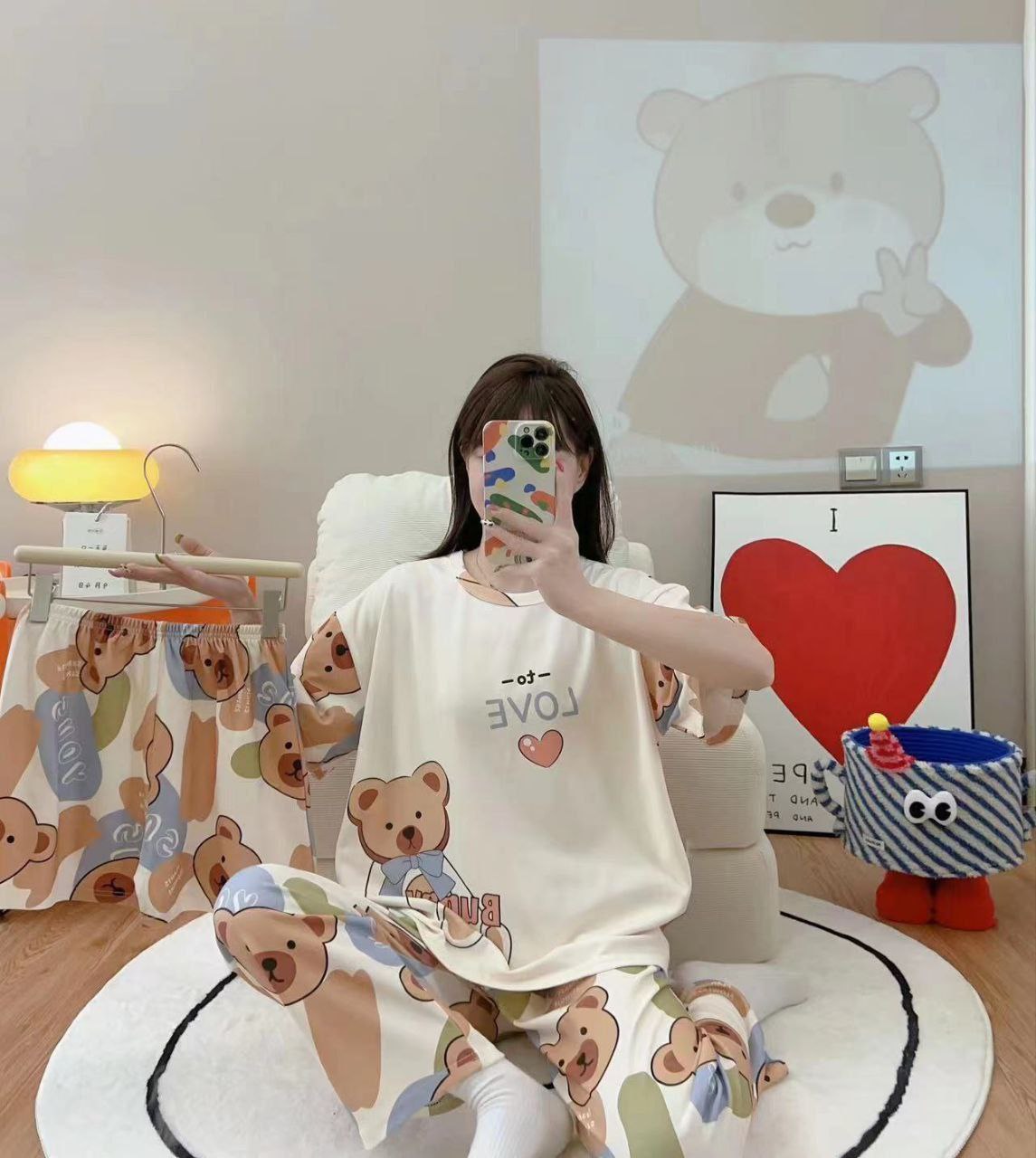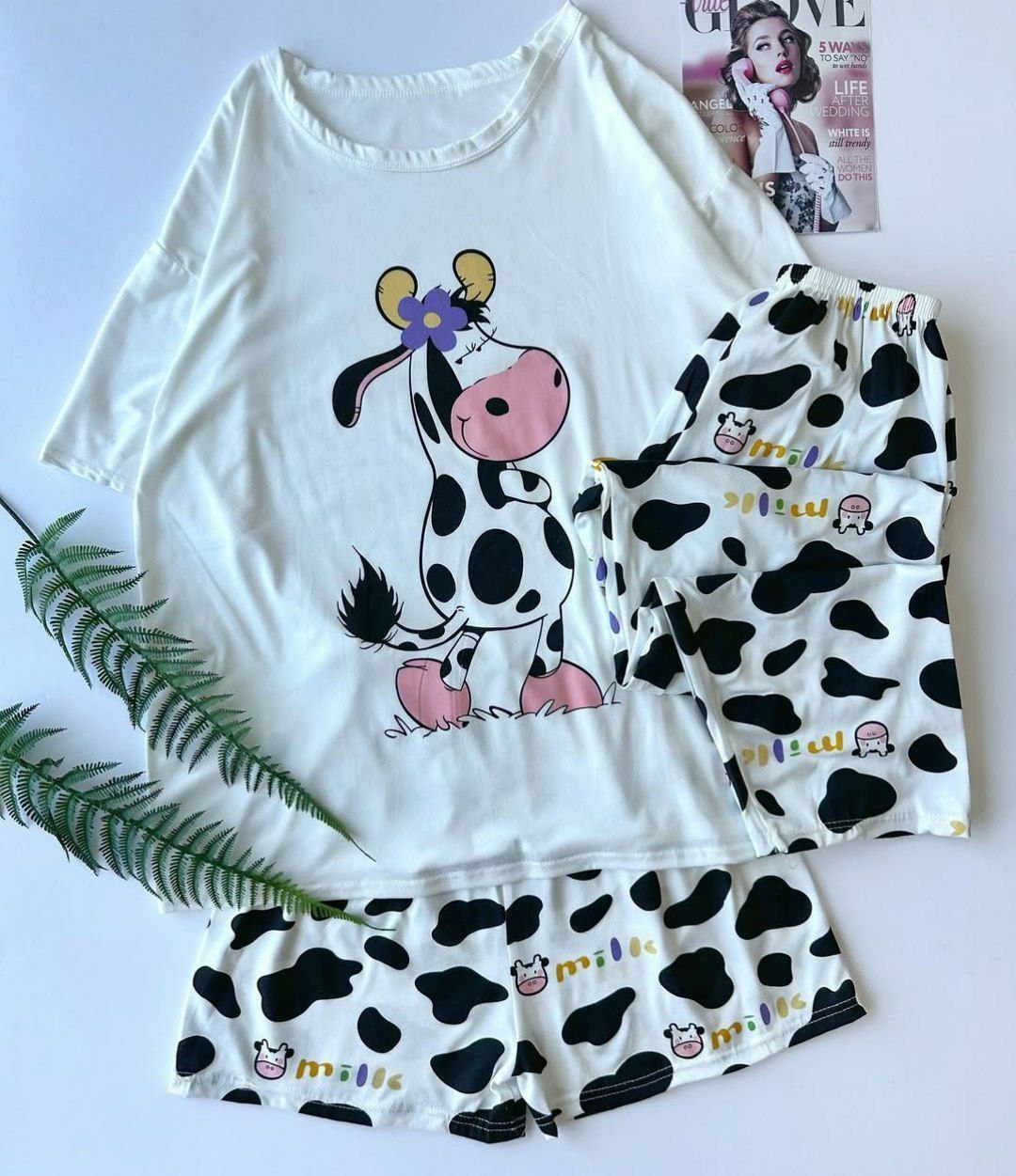 ست سه تکه راحتی دارای تیشرت +شلوار+شلوارک طرح فانتزی و جذاب جنس راحتی و خانگی مناسب استفاده روزمره وارداتی 60 طرح طبق تصویر سایز فری تا 46